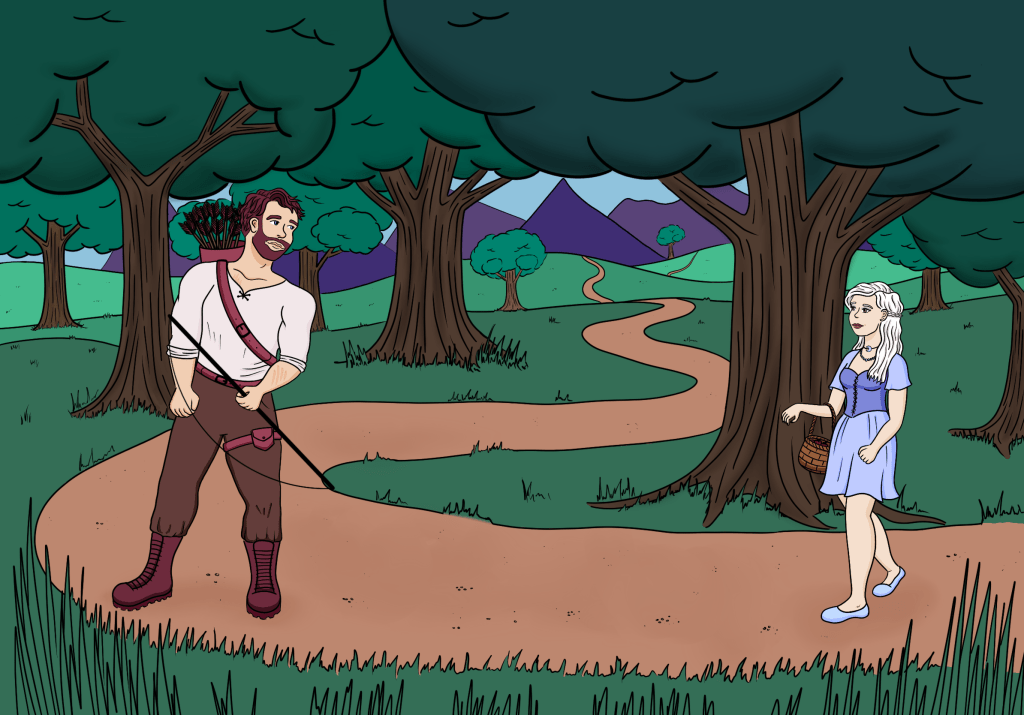 She snorts a derisive laugh out of her small nose. “What kind of man doesn’t introduce himself first?” She turns on her heel and begins to fade away, walking deeper into the forest.